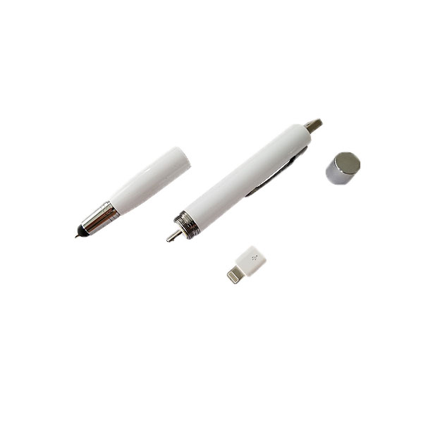Bolígrafo metálico con power bank integrado y touch. Puntera: Apertura del bolígrafo medio giro desde el touch. Cuerpo central Power Bank: Desenroscando el cuerpo aparece el conector para celular tipo B micro USB para la utilización de la carga (1000 mAh), provee un adaptador para I phone 5 y 6, y otro para la línea S8 y S9. Removiendo un capuchón detrás del clip posee una ficha USB para su carga.